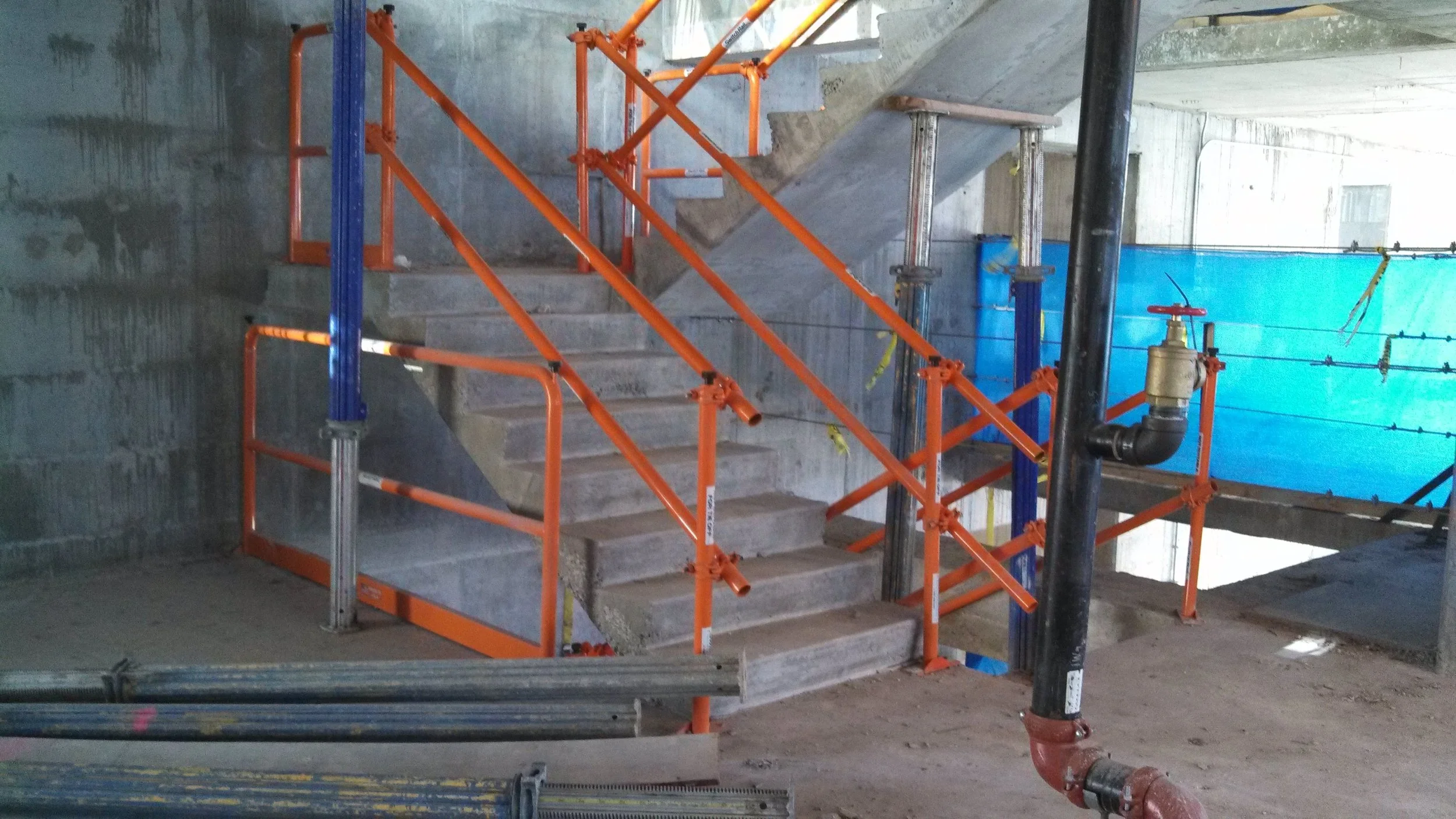 The customer asked us to do a trial "mock-up" of our standard anchored stair system. Upon getting the material to the mock-up stairwell, they put us on the clock. The installation took 37 minutes for one complete floor. They ordered 78 stair system setups, then adding additional rails around the perimeter of the stair landings and openings.