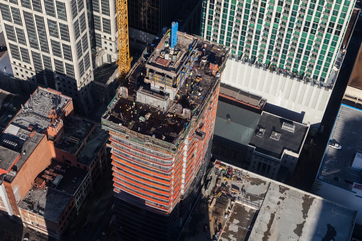 The customer asked for a 2 floor trial of our Standard Horizontal Clamp System. Once they initially set it up, they used it for the remaining 45 stories of the building. They also added our Standard Post Tension Anchored System for the perimeter and all other fall hazard areas throughout the project.